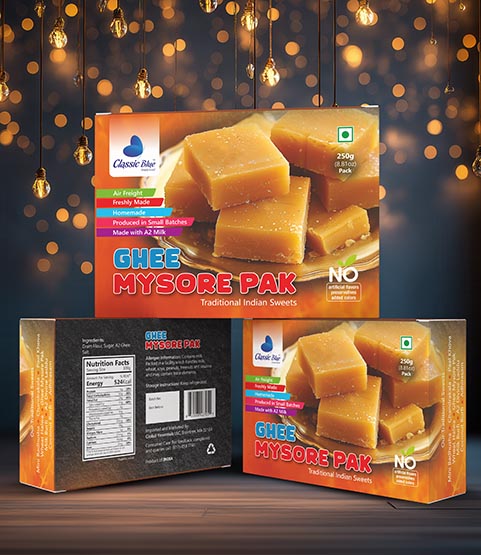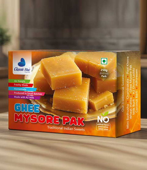 Every Classic Blue Mysore Pak carries the love of artisans and the dedication of farmers, making it a perfect addition to your festive celebrations. Ideal for Diwali, Pongal, Navratri, weddings, or gifting, it brings joy, richness, and nostalgia to your sweet moments.