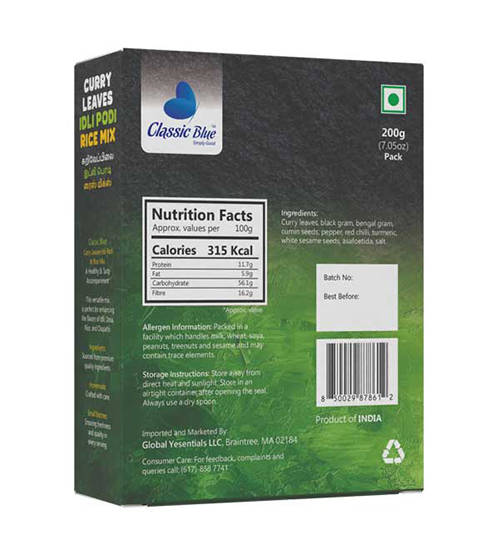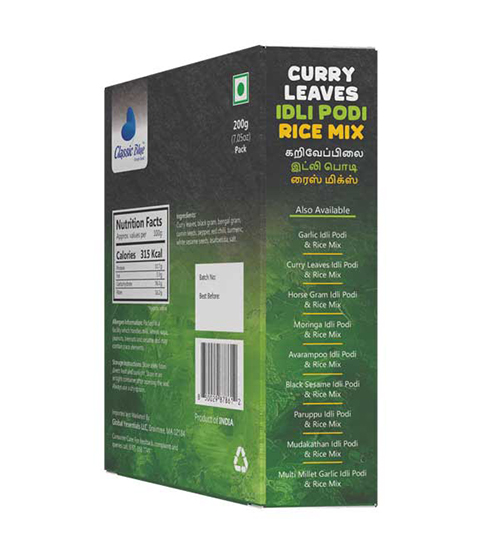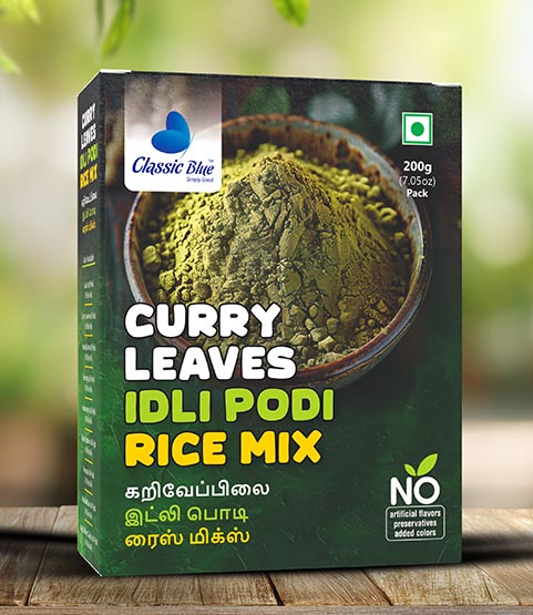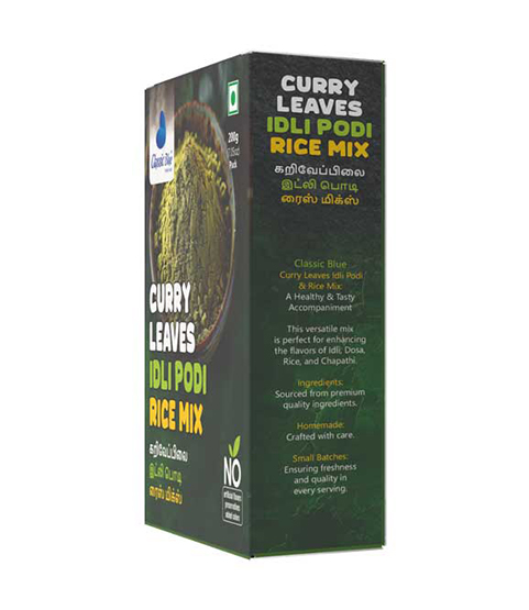 Bring the taste of tradition to your meals with Classic Blue Curry Leaf Rice Mix / Idly Podi! Made with fresh curry leaves, premium spices, and roasted lentils, this aromatic mix transforms rice, idly, dosa, or snacks into a delicious, flavorful experience, perfect for everyday meals and festive occasions.