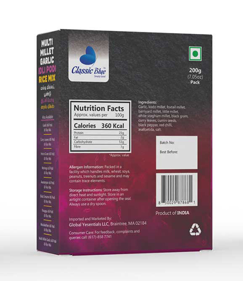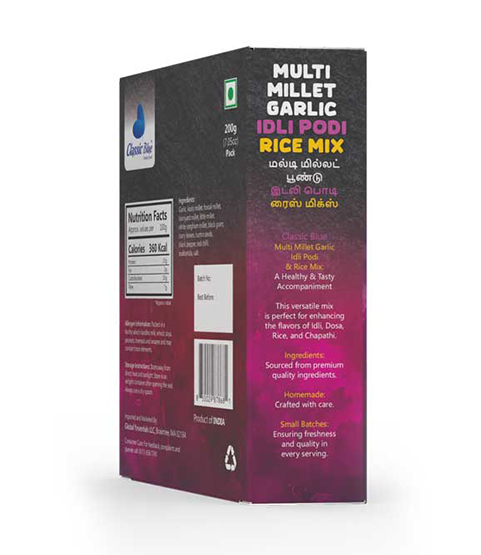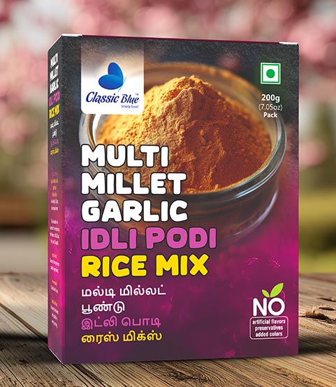 Elevate your meals with the power of millets and the aromatic punch of garlic with Classic Blue Multi Millet Garlic Rice Mix / Idly Podi! Made with a wholesome blend of multi millets, roasted lentils, and premium garlic, this mix brings nutrition, flavor, and tradition to your rice, idly, dosa, or upma, perfect for everyday meals and festive occasions.