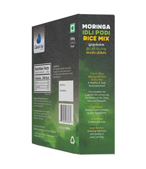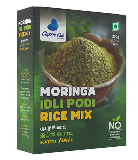 Elevate your meals with Classic Blue Moringa Rice Mix / Idly Podi / Dosa Podi – a wholesome blend of premium rice, moringa leaves, roasted lentils, and aromatic spices. This traditional South Indian mix is packed with nutrition, rich flavor, and heritage, perfect for rice, idly, dosa, upma, or festive snacks.