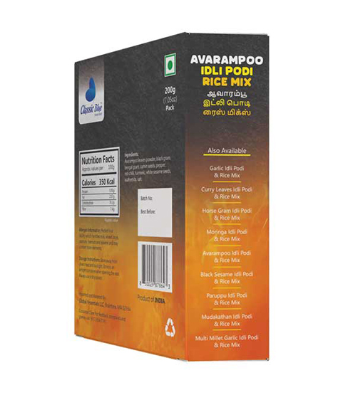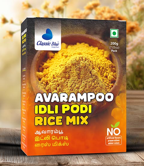 Bring authentic South Indian aroma and taste to your meals with Classic Blue Avaram Poo Rice Mix / Idly Podi / Dosa Podi! Made with premium rice, dried avaram (curry) flowers, roasted lentils, and aromatic spices, this traditional mix adds flavor, heritage, and festive charm to rice, idly, dosa, or upma.