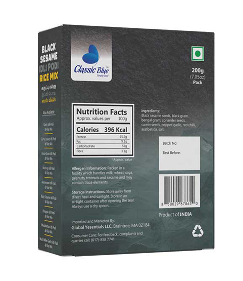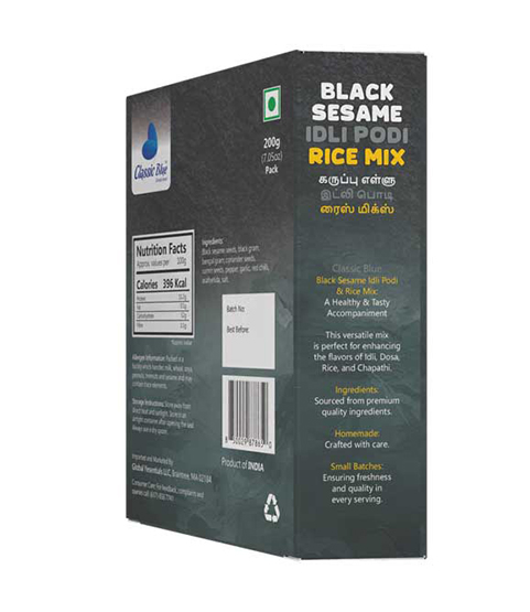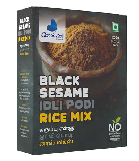 Experience the rich, nutty flavor of Classic Blue Black Sesame Rice Mix / Idly Podi! Made with premium black sesame seeds, roasted lentils, and aromatic spices, this traditional South Indian mix adds nutrition, flavor, and heritage to your rice, idly, dosa, or upma. Perfect for everyday meals and festive occasions.