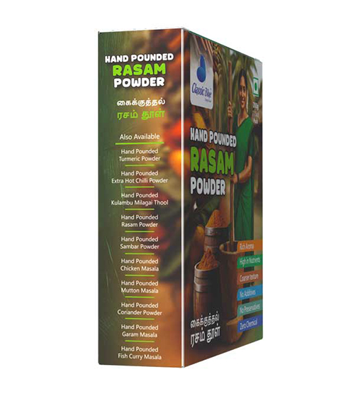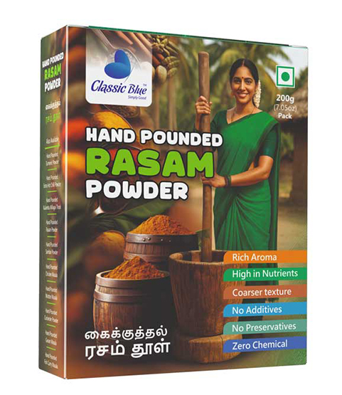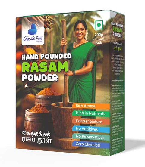At Classic Blue, we celebrate South Indian culinary heritage. Our Handpound Rasam Powder is more than a spice mix β itβs a comforting taste of tradition, authenticity, and care in every pinch.