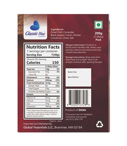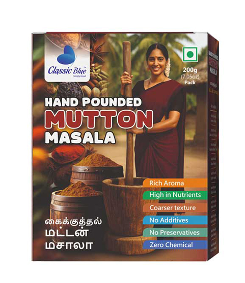 Turn every home-cooked mutton dish into a restaurant-style delicacy with Classic Blue Handpound Mutton Masala. Using traditional handpounding techniques, this masala preserves aroma, natural oils, and authentic flavors, delivering a perfectly balanced spice blend for curries, biryanis, and gravies.