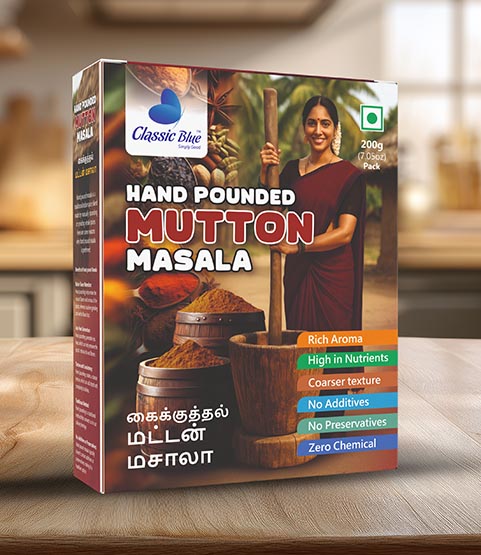 At Classic Blue, we bring heritage culinary practices to your home. Our Handpound Mutton Masala is more than a spice mix β itβs a flavorful journey from traditional kitchens to your dining table, ensuring authenticity and taste in every bite.