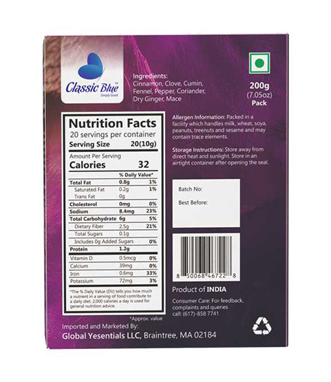 - Premium Ingredients β Crafted from sun-dried whole spices like cardamom, cloves, cinnamon, pepper, cumin, and coriander.