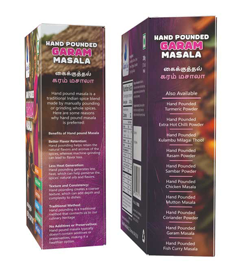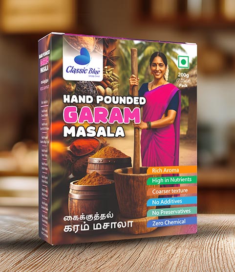 Elevate your cooking with the rich aroma and bold flavor of Classic Blue Handpound Garam Masala. Traditionally stone-ground by hand, this spice blend preserves natural oils, aroma, and potency, making every curry, biryani, or gravy a true celebration of South Indian culinary heritage.