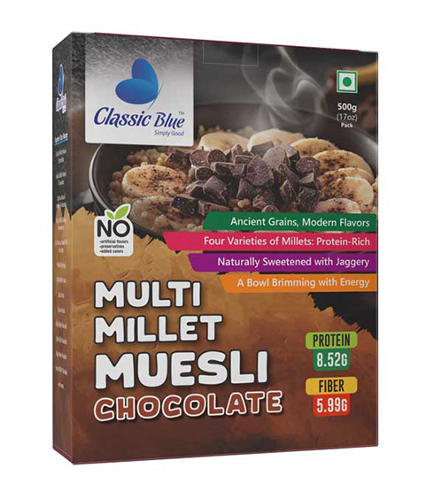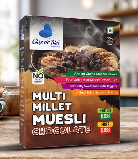 Every bite of Classic Blue Multi Millet Muesli Chocolate is crafted with love from farmers and care from artisans, bringing together health, happiness, and tradition in a modern, tasty way.