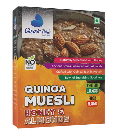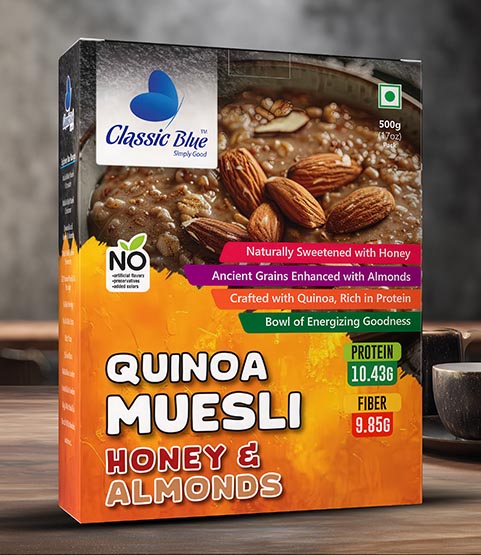 Start your mornings with the power of quinoa, the crunch of almonds, and the sweetness of pure honey. Classic Blue Quinoa Muesli Honey & Almond is a wholesome, protein-rich, and naturally sweetened breakfast that keeps you energized, healthy, and satisfied all day long.