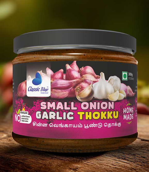 Elevate your meals with the bold, tangy flavors of small onion and garlic in Classic Blue Small Onion Garlic Thokku! Made with premium small onions, fresh garlic, hand-picked spices, and natural oils, this South Indian thokku adds zesty, savory, and aromatic goodness to rice, idly, dosa, or snacks, making every bite memorable and irresistible.