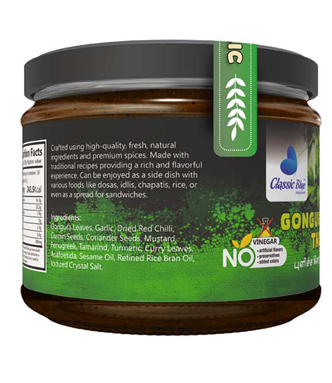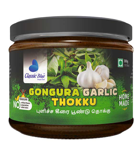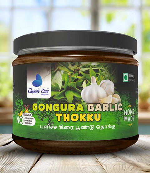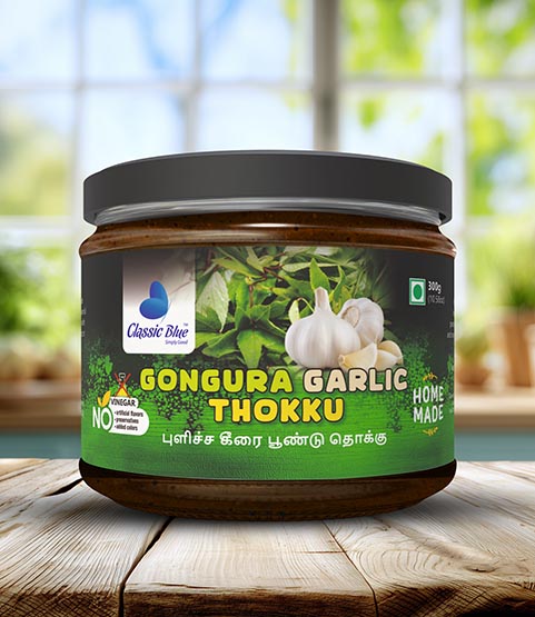 Experience the bold and tangy flavors of South India with Classic Blue Gongura Garlic Thokku! Made with premium gongura leaves, fresh garlic, hand-picked spices, and natural oils, this thokku adds a zesty, aromatic punch to rice, idly, dosa, or snacks, making every meal delicious, vibrant, and unforgettable.